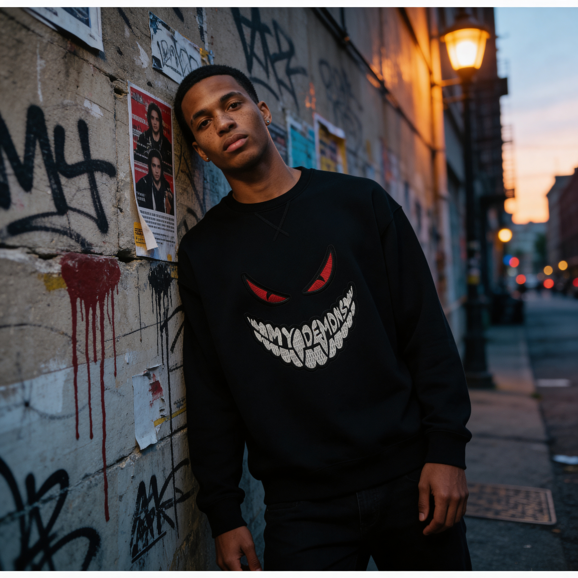 • Embroidered “MY DEMONS” grin